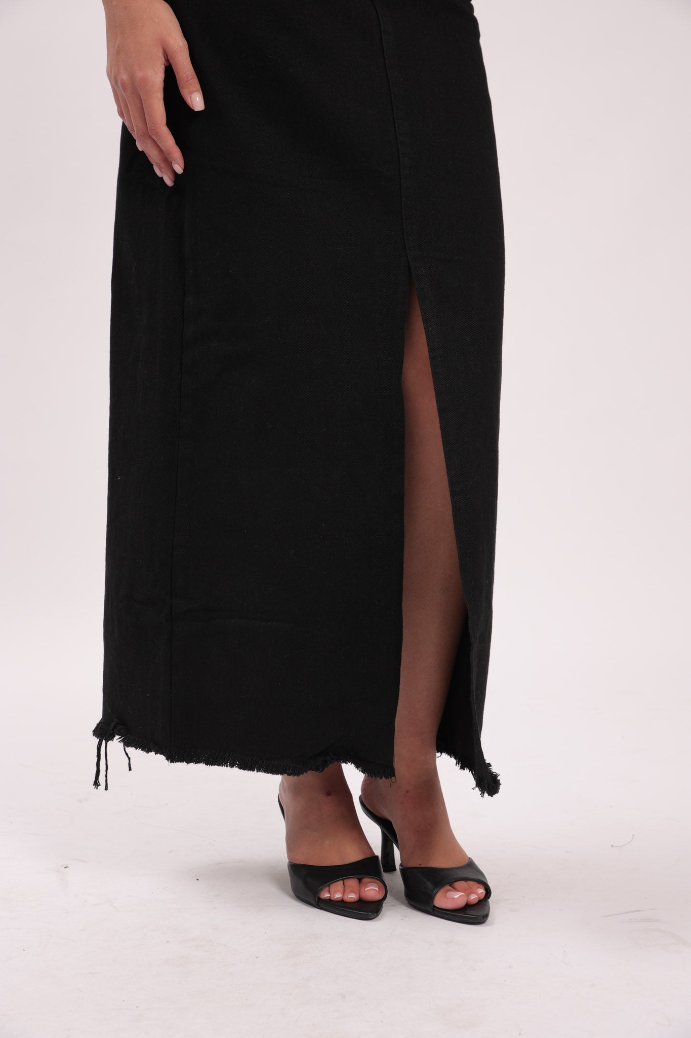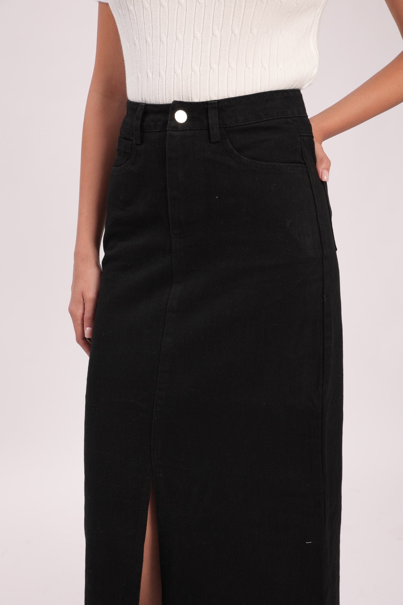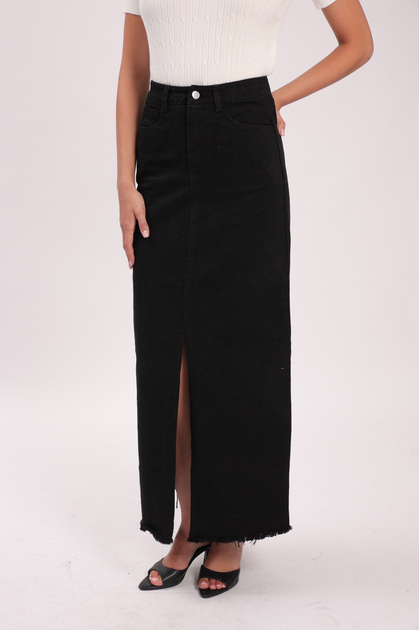 חצאית גינס עם לייקרה, שסע מקדימה, החצאית מגיעה ללא חגורה
