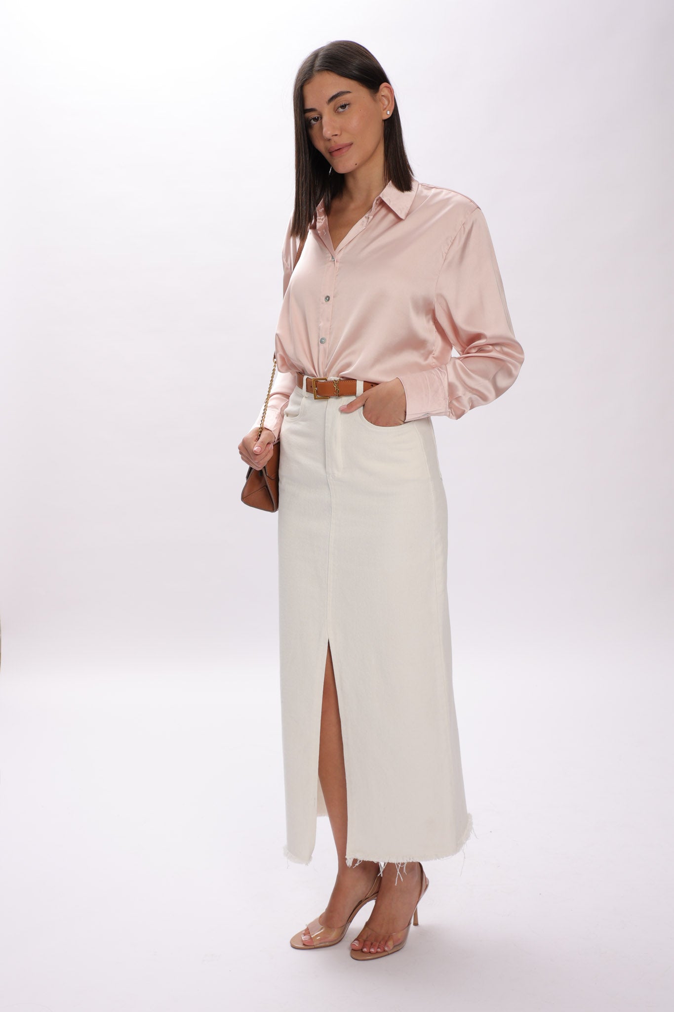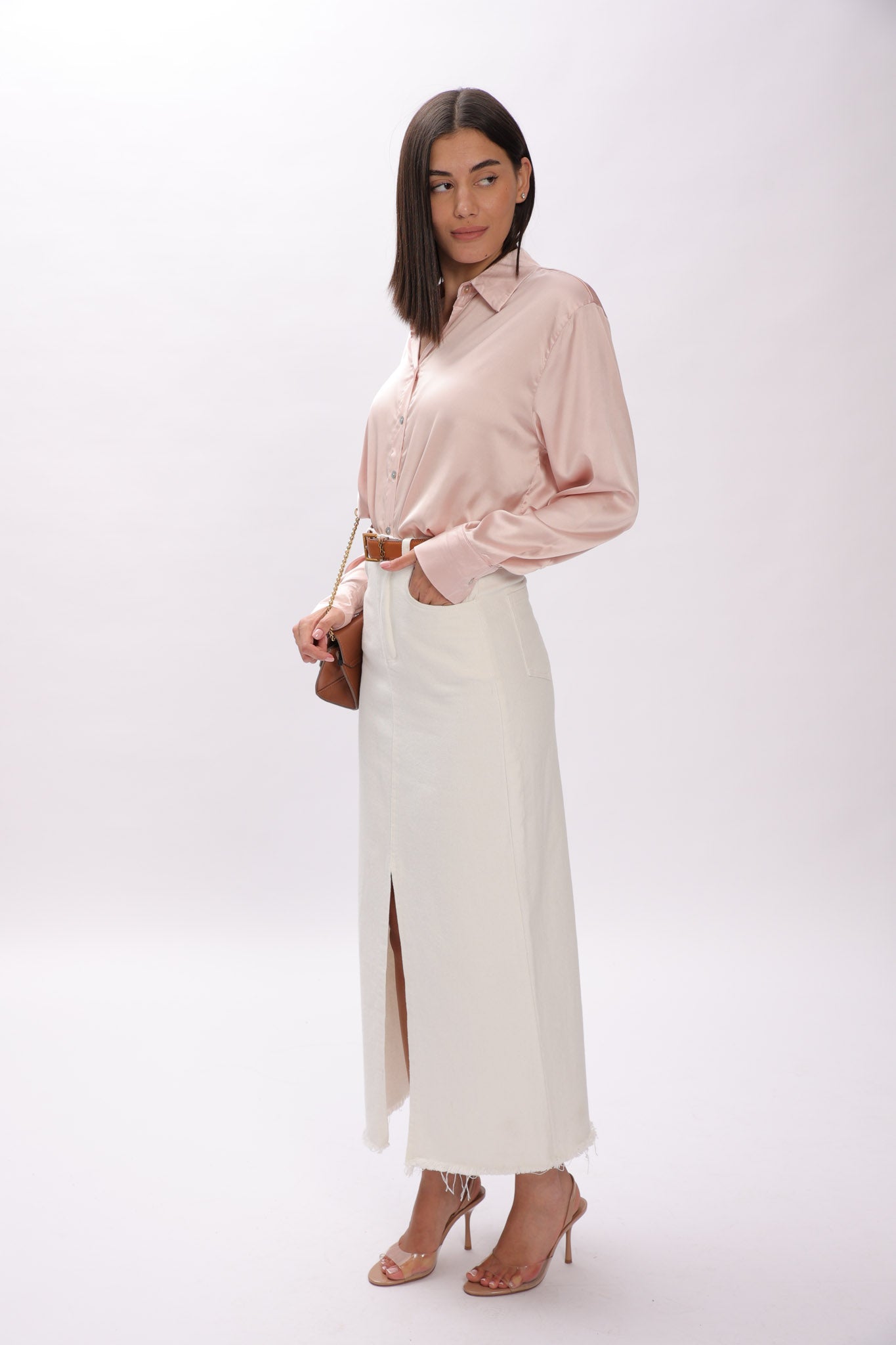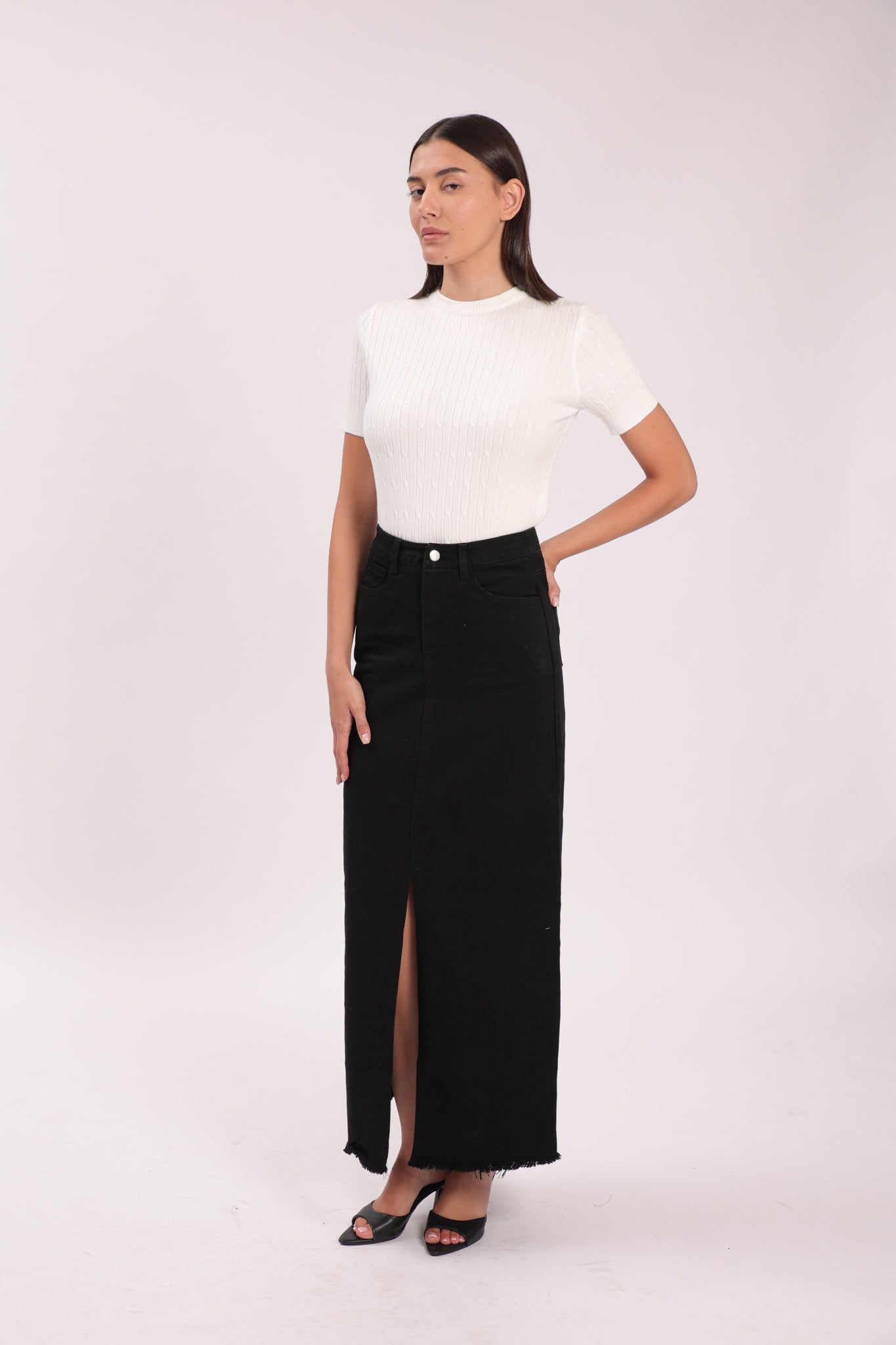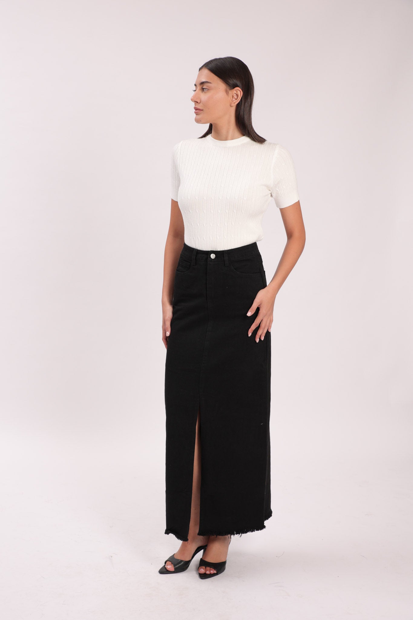 חצאית גינס עם לייקרה, שסע מקדימה, החצאית מגיעה ללא חגורה