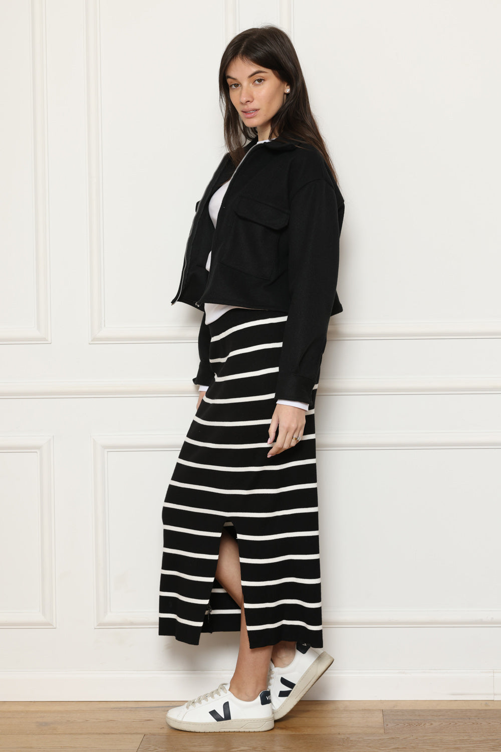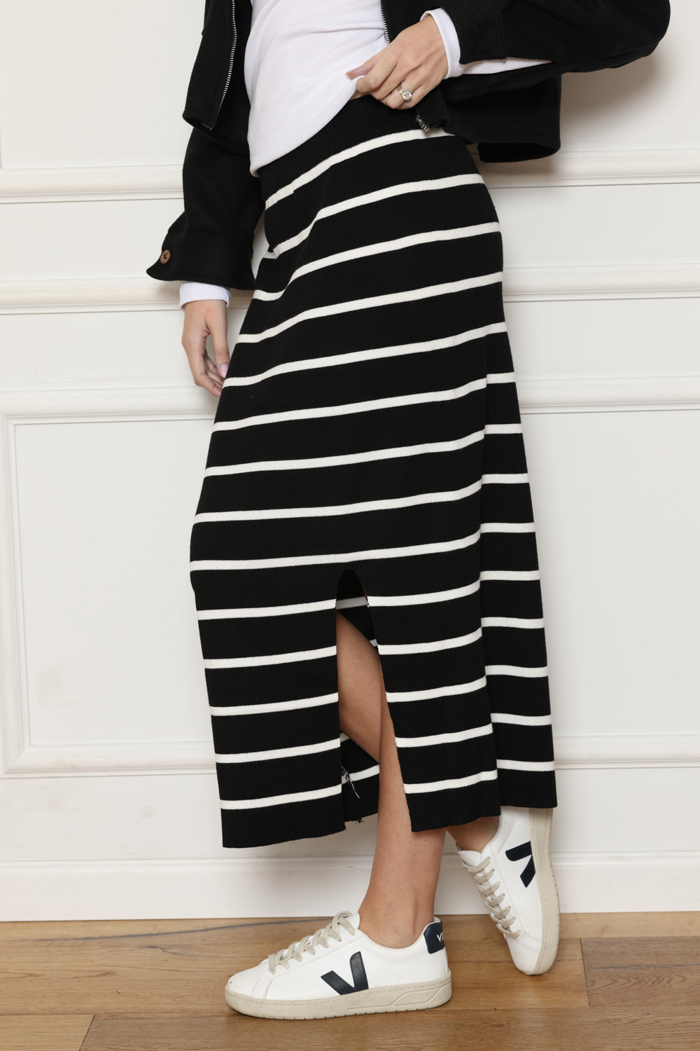 חצאית מושלמת בד סריג , שסע בצד אחד של החצאית.