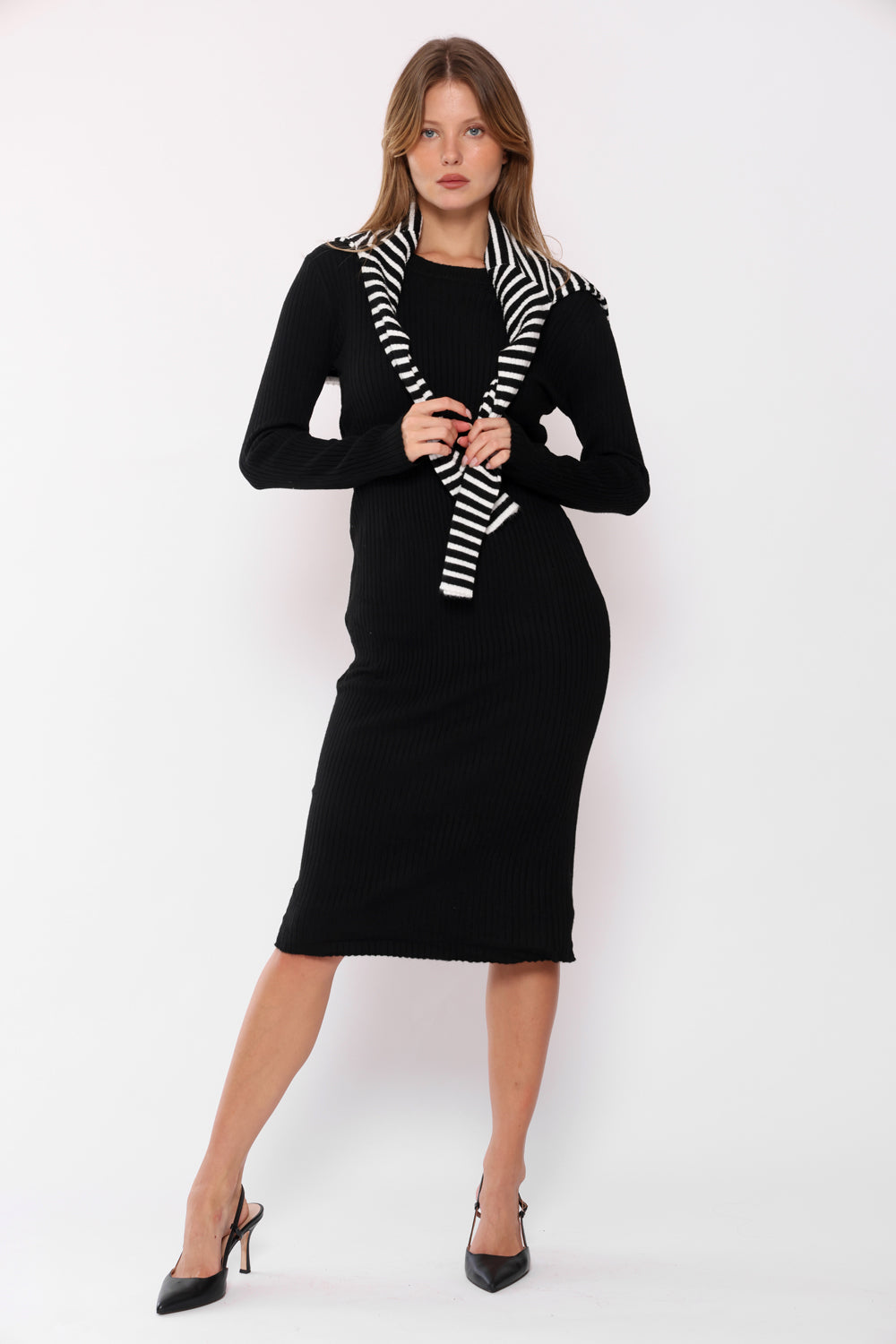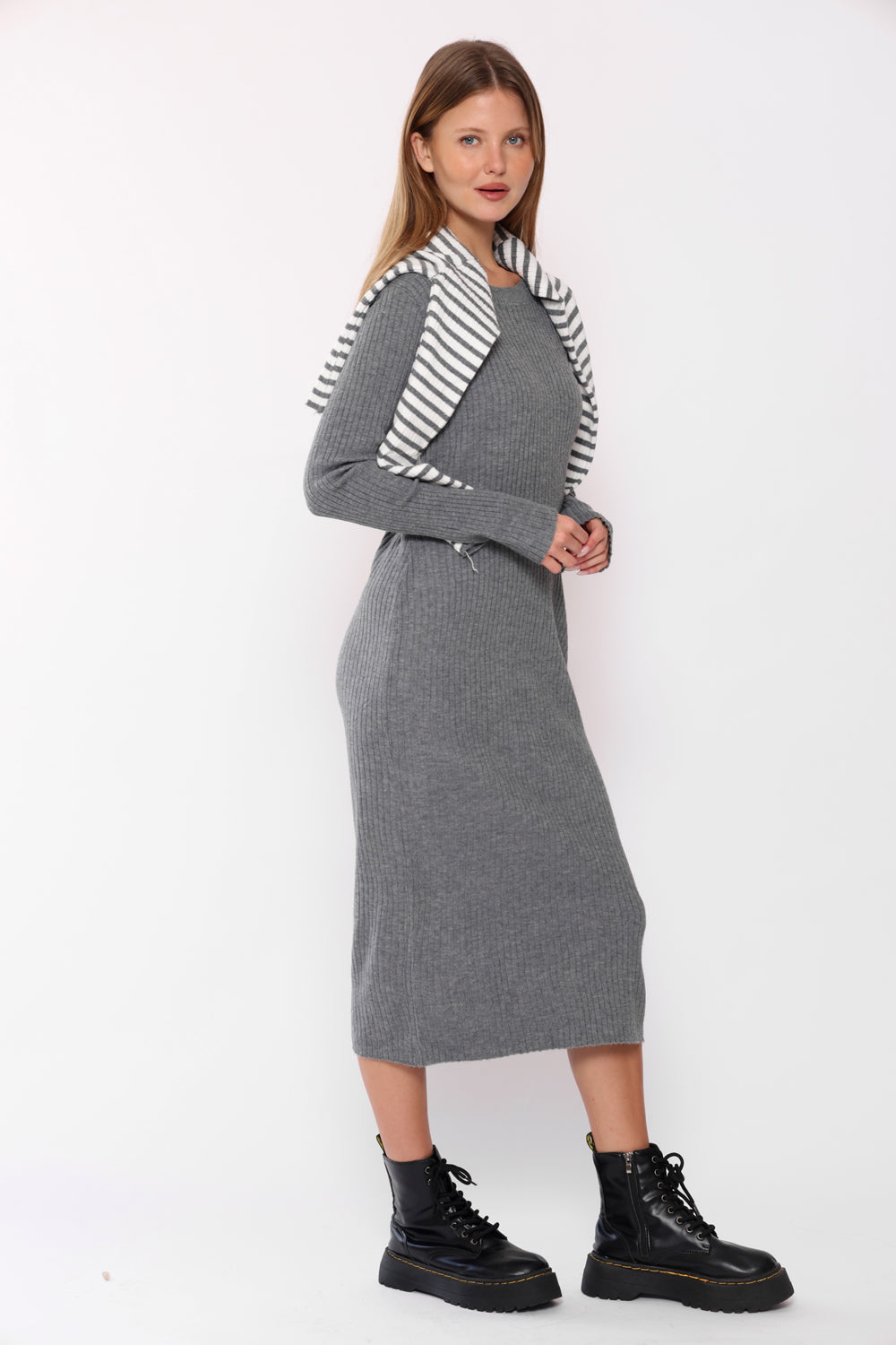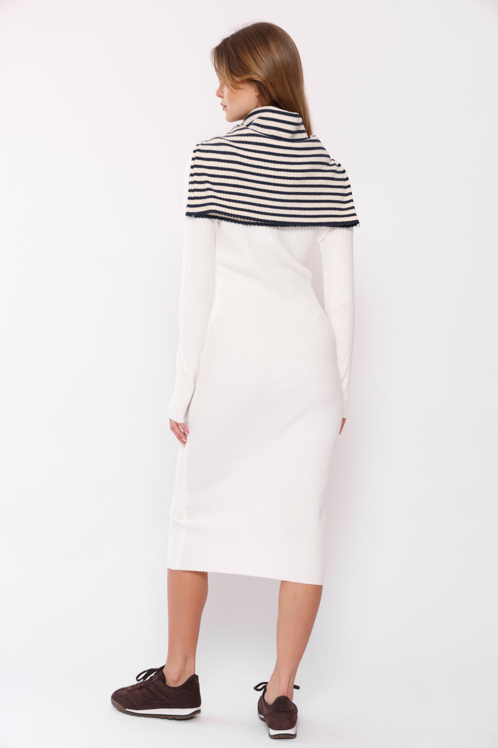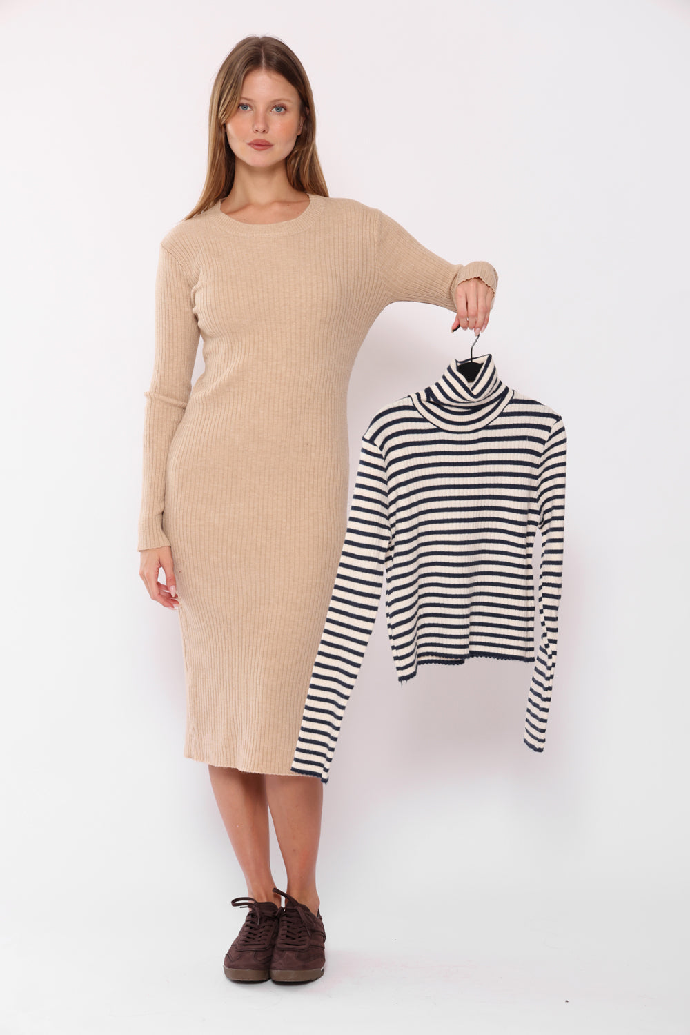 2 פריטים - שמלה סריג ניקי, מגיעה עם סרט לקשירה וחולצת סריג גולף פסים (ניתן ללבוש את השמלה ללא הסרט וללא החולצה)