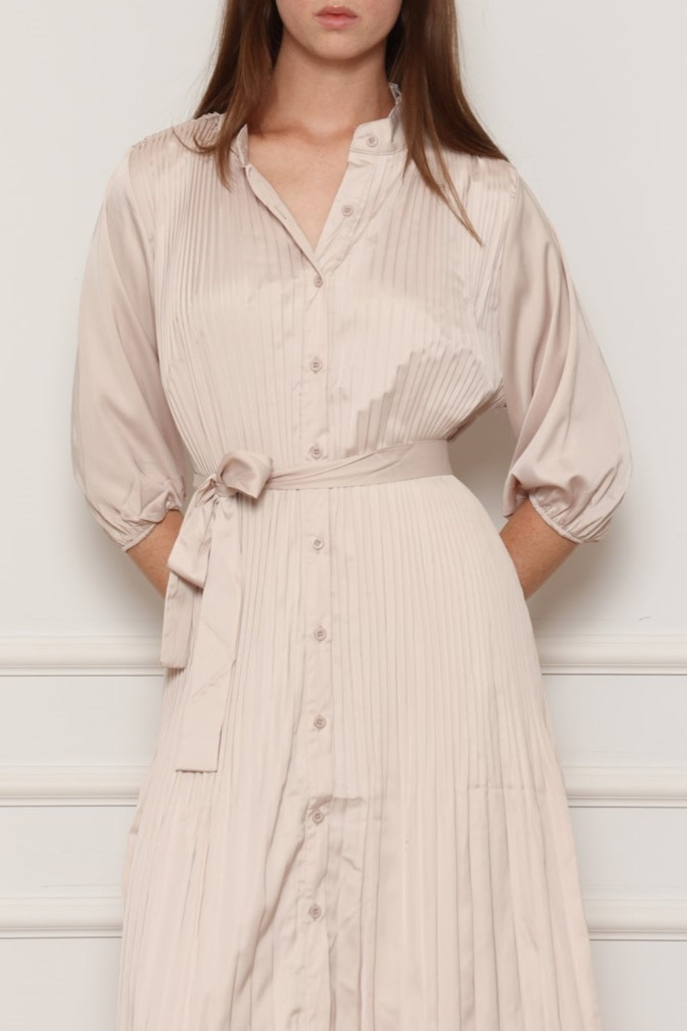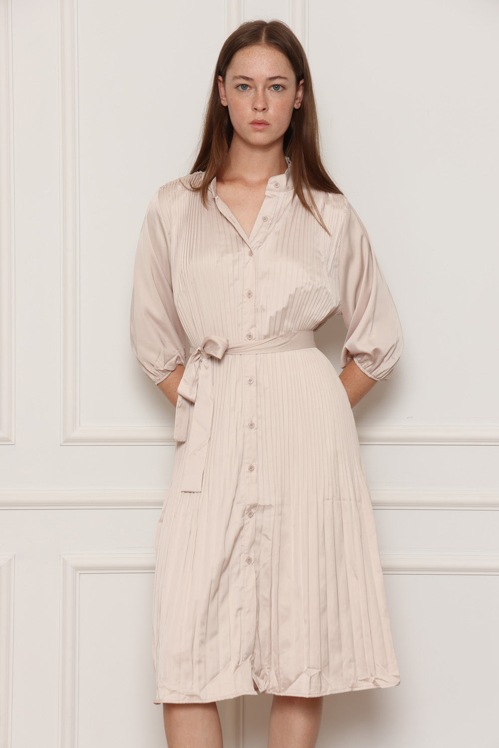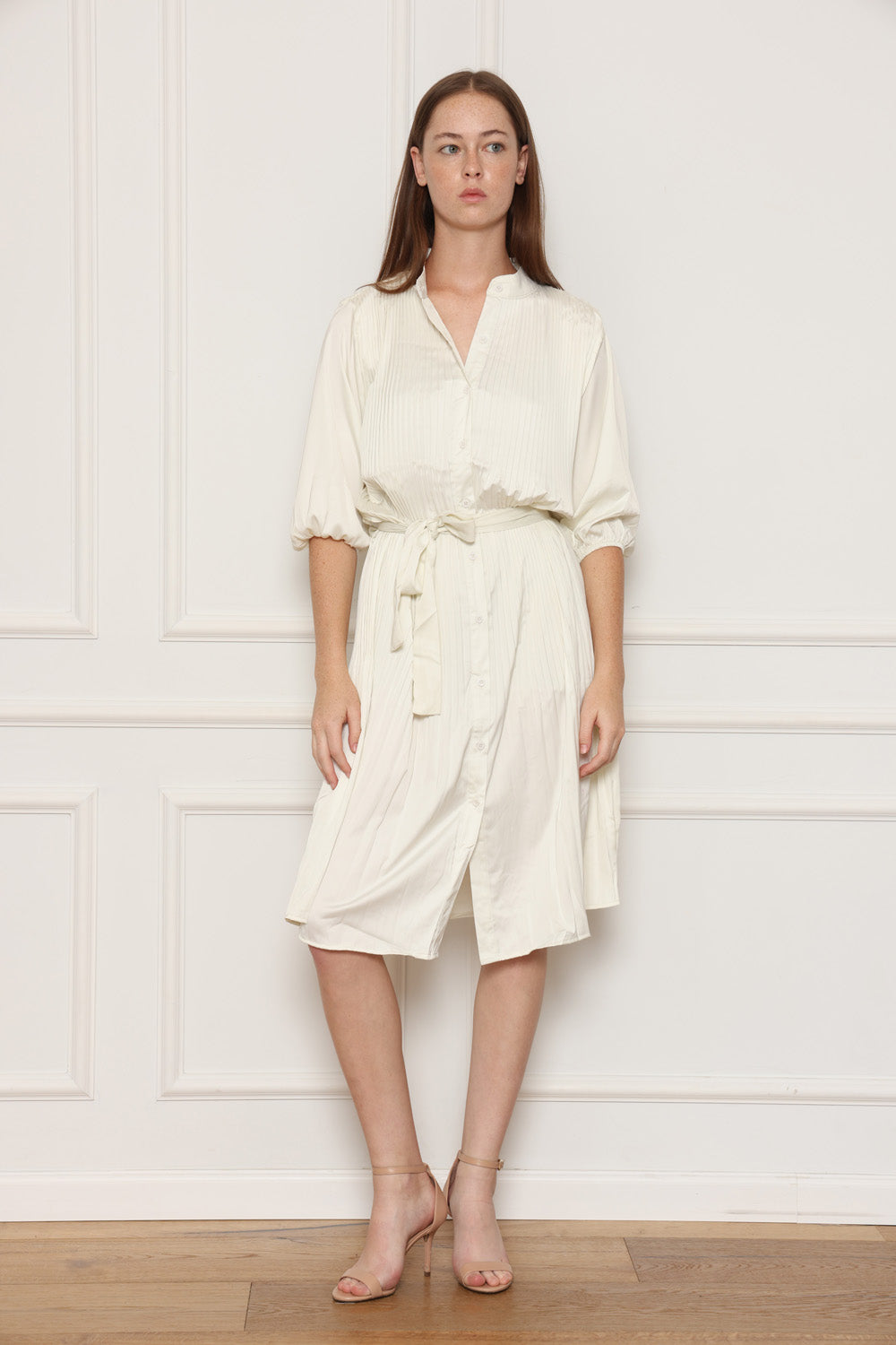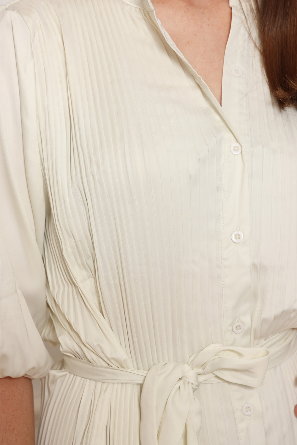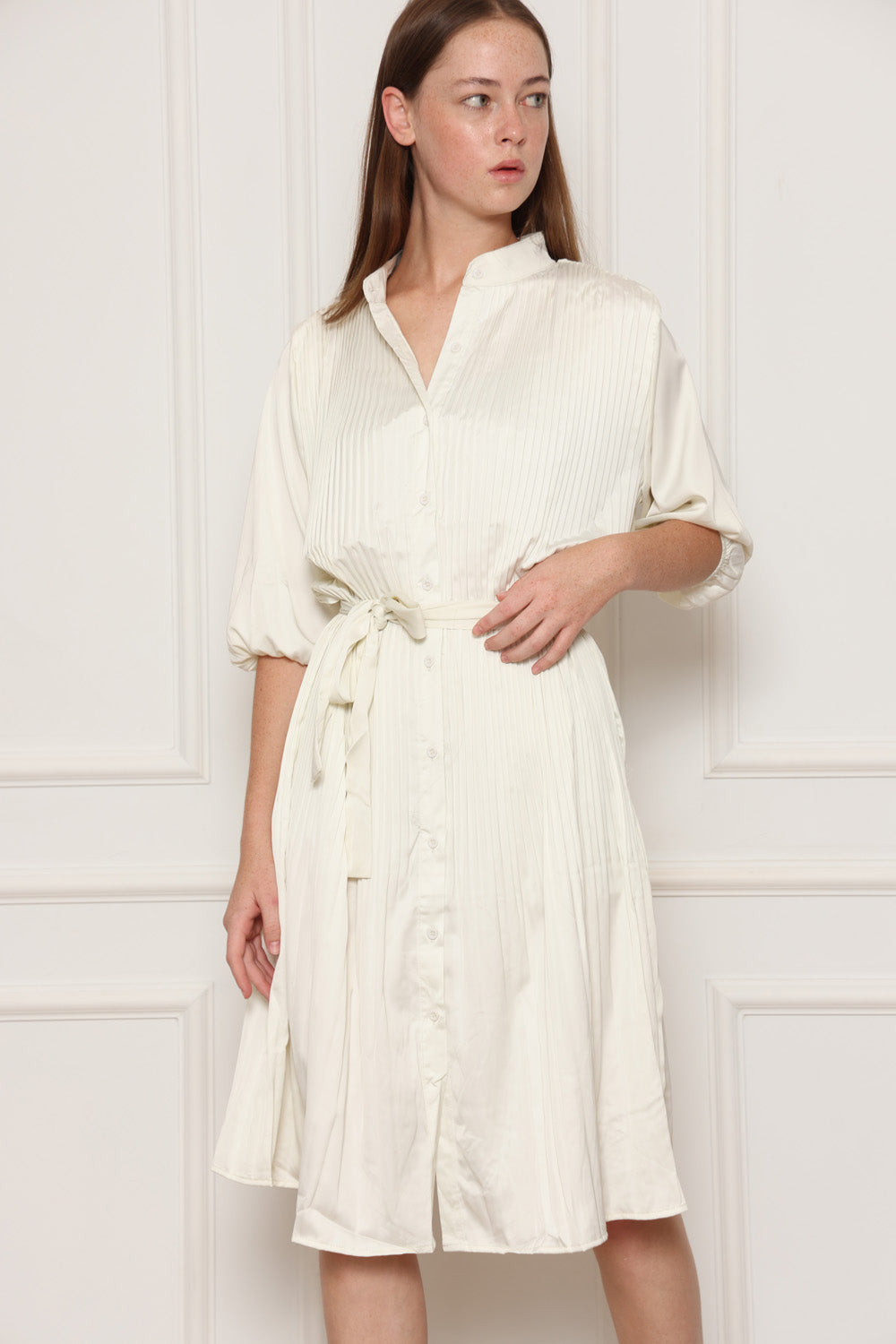 שמלה מכופתרת עם חגורת סרט, כיווץ קל בשרוול